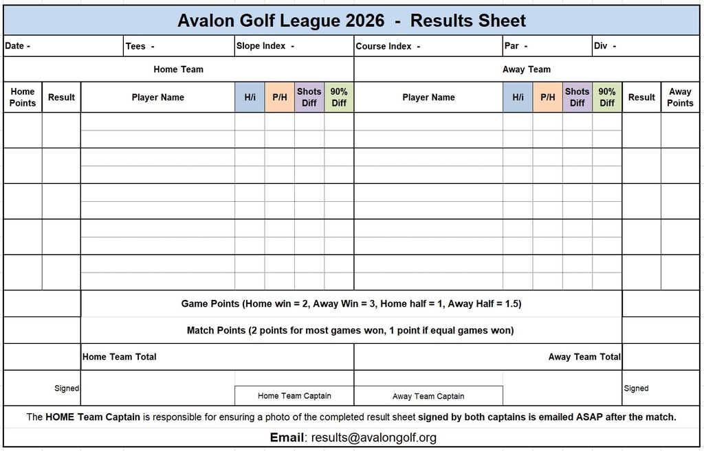 Please email a photo of the completed result sheet to the address below. It must be signed by both captains.